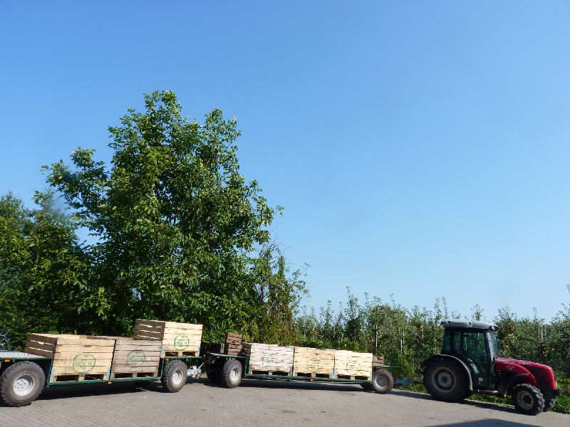 5. Am Ende wird jeder Apfel vorsichtig in die 300 kg Großkiste gelegt.